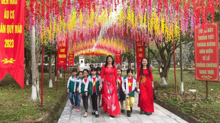 Cô trò Trường Tiểu học Hạ Hòa trải nghiệm học tập tại Đền Mẫu Âu Cơ. Ảnh: NTCC