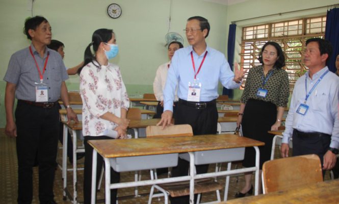 Thứ trưởng Phạm Ngọc Thưởng kiểm tra công tác chuẩn bị thi tốt nghiệp THPT tại điểm thi Trường THPT Võ Minh Đức (Bình Dương). Ảnh: Hồ Phúc.