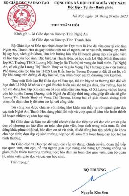 Bộ trưởng Nguyễn Kim Sơn thay mặt lãnh đạo Bộ GD&ĐT gửi thư thăm hỏi tới 2 sở GD&ĐT: Nghệ An, Thanh Hoá sau đợt mưa lũ.