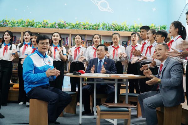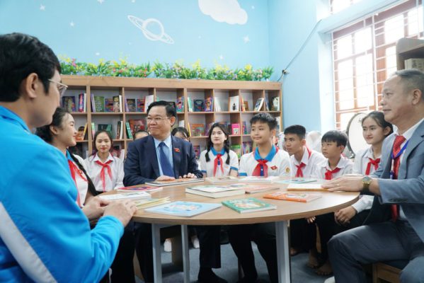 Chủ tịch Quốc hội Vương Đình Huệ thăm không gian đọc sách, tương tác và sinh hoạt Đội, trò chuyện cùng học sinh Trường THCS Nam Thanh, Nam Đàn, Nghệ An. Ảnh: Hồ Lài.