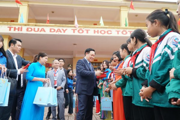 Dịp này, Chủ tịch Quốc hội Vương Đình Huệ cũng trao quà lưu niệm cho nhà trường, lì xì may mắn cho giáo viên, học sinh.
