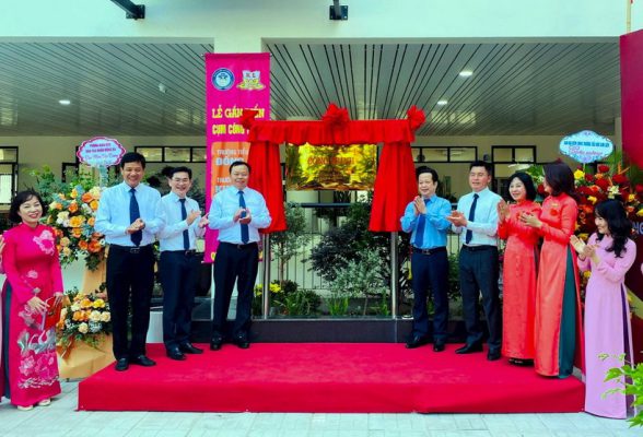 Các đại biểu thực hiện nghi thức gắn biển công trình tại Trường Tiểu học Kim Liên.