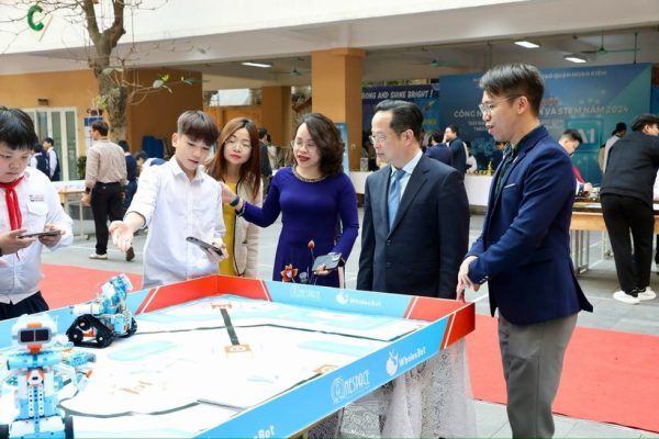 Lãnh đạo Sở GD&ĐT Hà Nội cùng học sinh trải nghiệm các sản phẩm STEM.