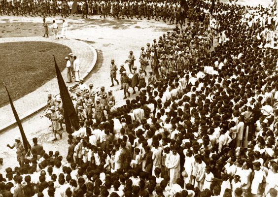 Chủ tịch Hồ Chí Minh bước xuống lễ đài sau khi đọc xong bản Tuyên ngôn độc lập.