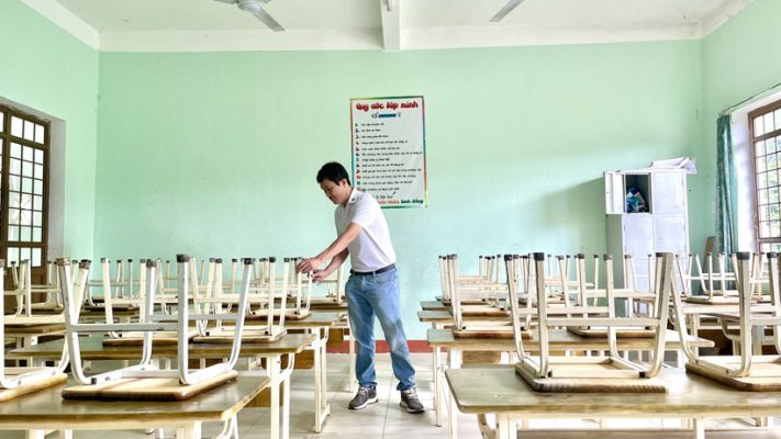 Thầy Nguyễn Đình Tịnh – giáo viên của trường còn mua thêm ít cây xanh điểm tô thêm màu sắc cho phòng học. Trải qua thời gian dài gắn bó với vùng khó, thầy Tịnh cũng quen với việc cắt, dán… hình ảnh, con vật trang trí khắp phòng để trò hào hứng khi trở lại trường. Những phần quà, gồm bánh, kẹo và đồ dùng học tập cũng được thầy Tịnh chuẩn bị sẵn để tặng cho học sinh vào đầu năm học mới.