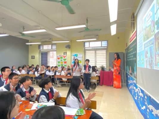 Hay thầy Bùi Anh Quân với bài học vô cùng thú vị mang tên “Natural disasters”. Để thu hút sự chú ý, quan tâm của học sinh, ngay đầu tiết học, thầy Quân tổ chức trò chơi đoán từ thông qua hành động. Sau đó, Thầy Quân đã giới thiệu các em học sinh lớp 8E về những hậu quả của thiên nhiên: Núi lửa, động đất, lũ lụt, … để các em có thêm vốn từ vựng trong chủ đề. Thầy giáo đã chia lớp học thành 4 đội chơi khiến cho không khí lớp học trở nên sôi nổi.
