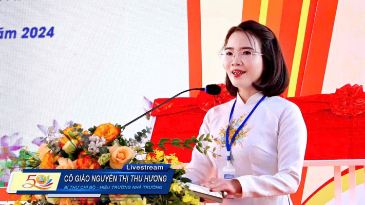 Phát biểu tại buổi lễ, Cô giáo Nguyễn Thị Thu Hương – Bí thư Chi bộ, Hiệu trưởng nhà trường bày tỏ lòng biết ơn sâu sắc đến các cấp lãnh đạo, các thế hệ thầy cô giáo và học sinh đã đồng hành cùng trường trong suốt hành trình 50 năm. Cô nhấn mạnh rằng từ một ngôi trường nhỏ với cơ sở vật chất còn hạn chế, Trường THCS Quang Trung đã không ngừng phát triển, trở thành điểm sáng về chất lượng giáo dục của thành phố.
