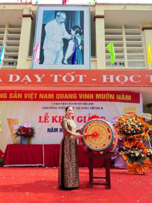 Nhà giáo Nguyễn Ngọc Linh – Bí thư chi bộ, Hiệu trưởng nhà trường  đánh trống khai giảng năm học mới 2023 – 2024